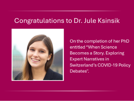 PhD completion: Jule Ksinsik When Science Becomes a Story. Exploring Expert Narratives in Switzerland’s COVID-19 Policy Debates Jule Ksinsik (KPM) successfully completed and was awarded her PhD thesis February 2026. See here for further information